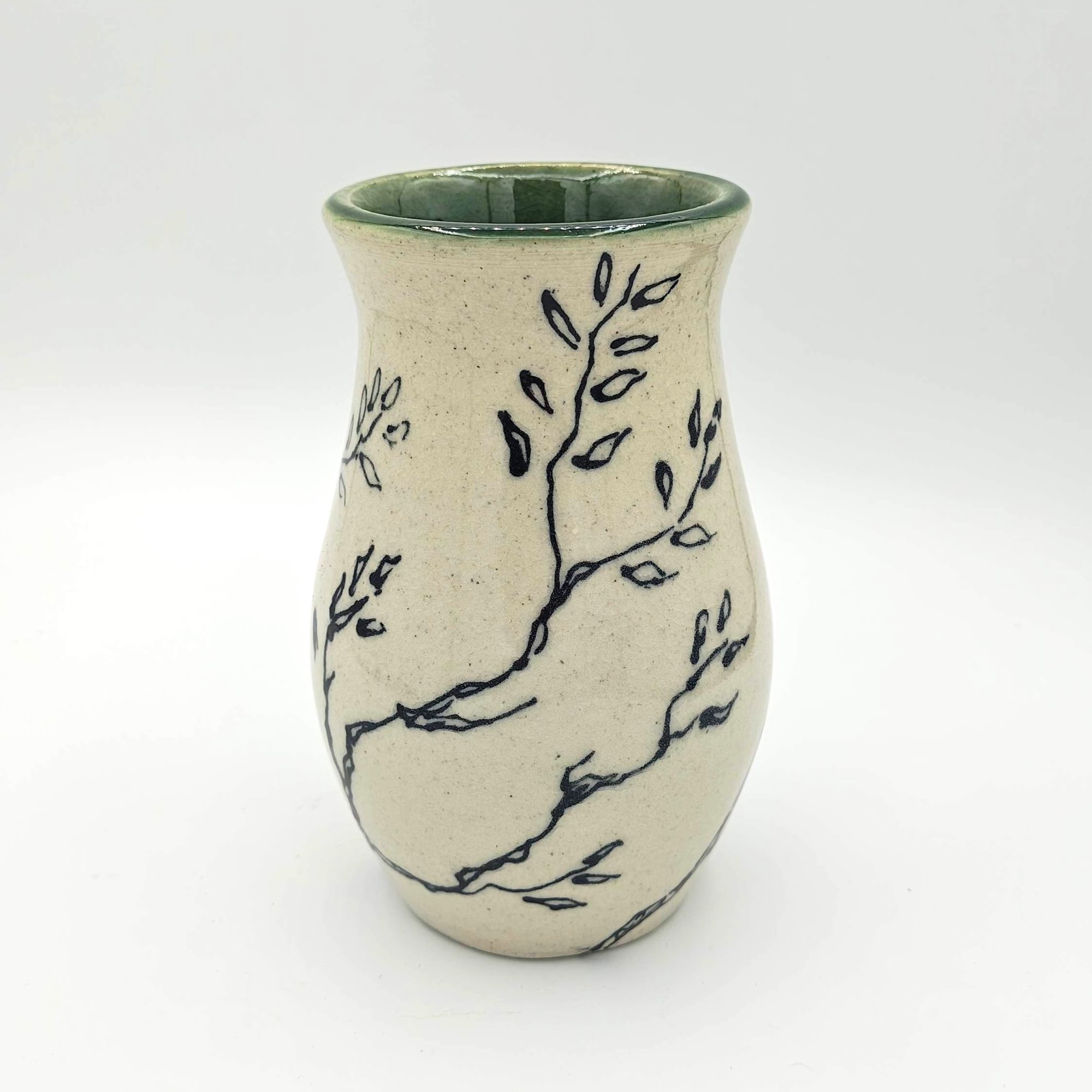 Small vase with black drawn branches/clear glaze exterior. Dark green glazed interior on white clay body.