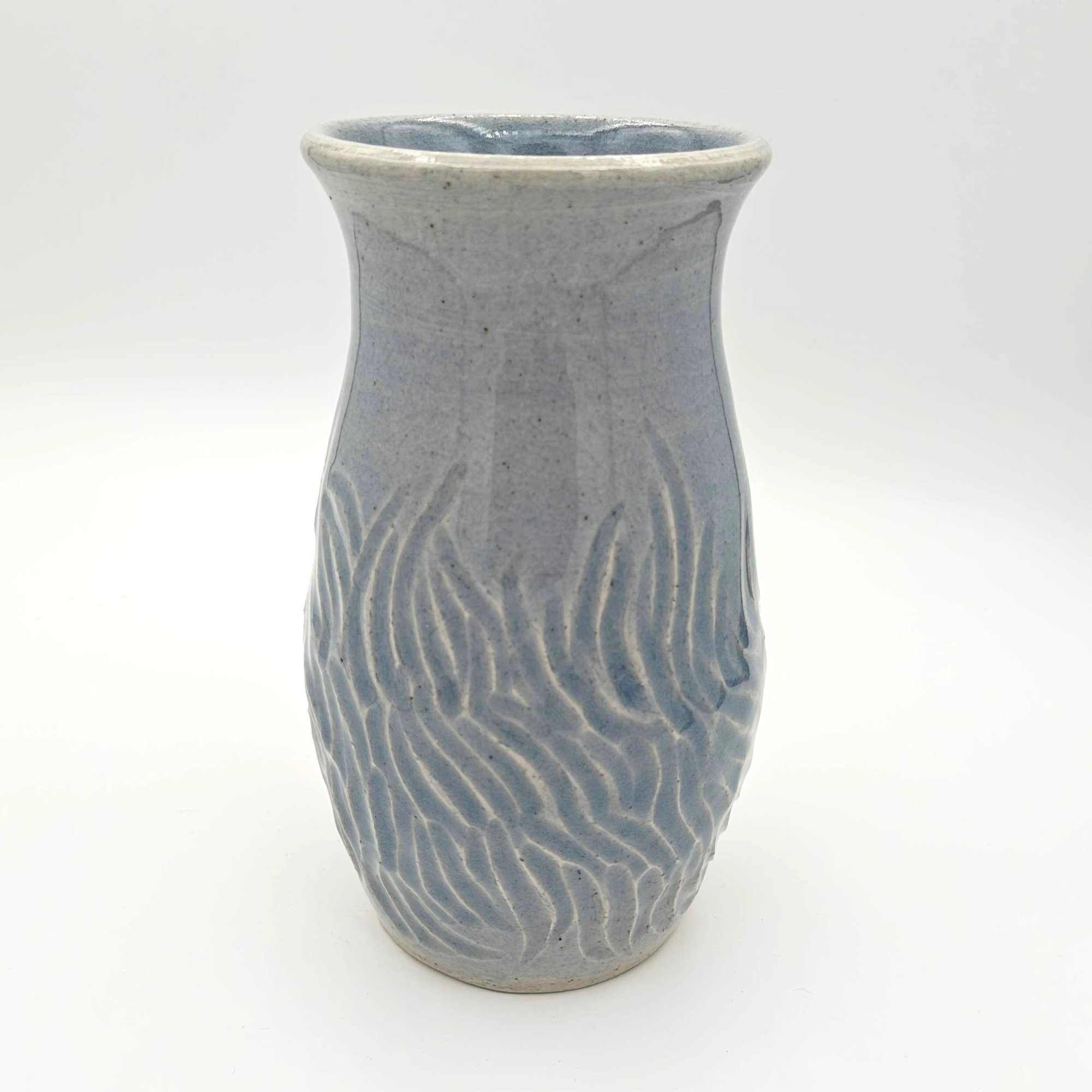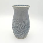 Small vase glazed with transparent blue glaze with carved accents. White clay body.