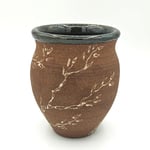 Small vase with white branches on dark brown raw clay exterior. Dark green glazed interior and rim.