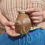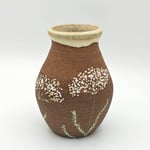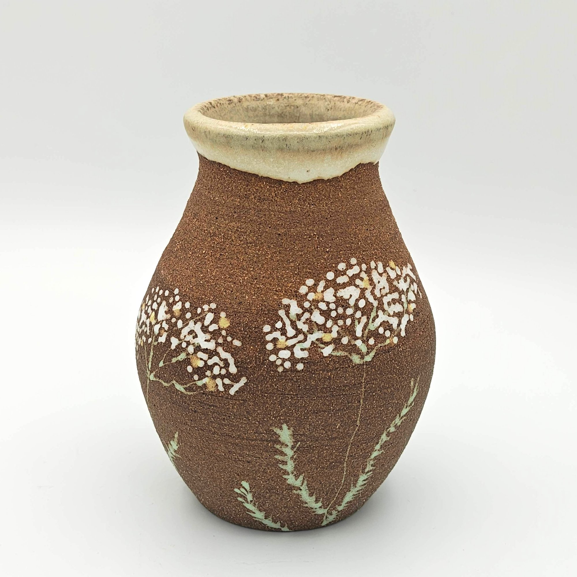 Small vase with yarrow plants drawn on dark brown raw clay exterior. Cream-colored glazed interior and rim.